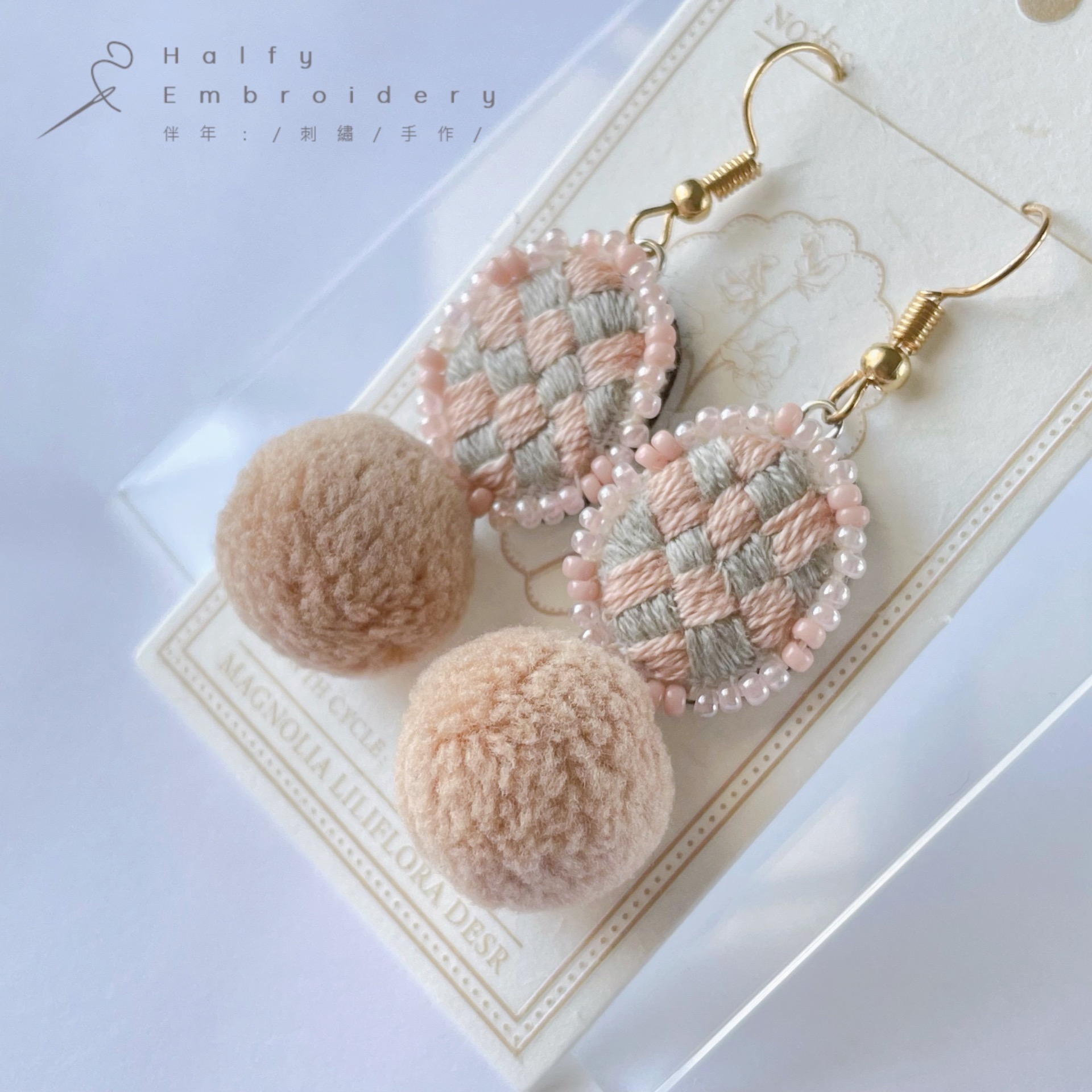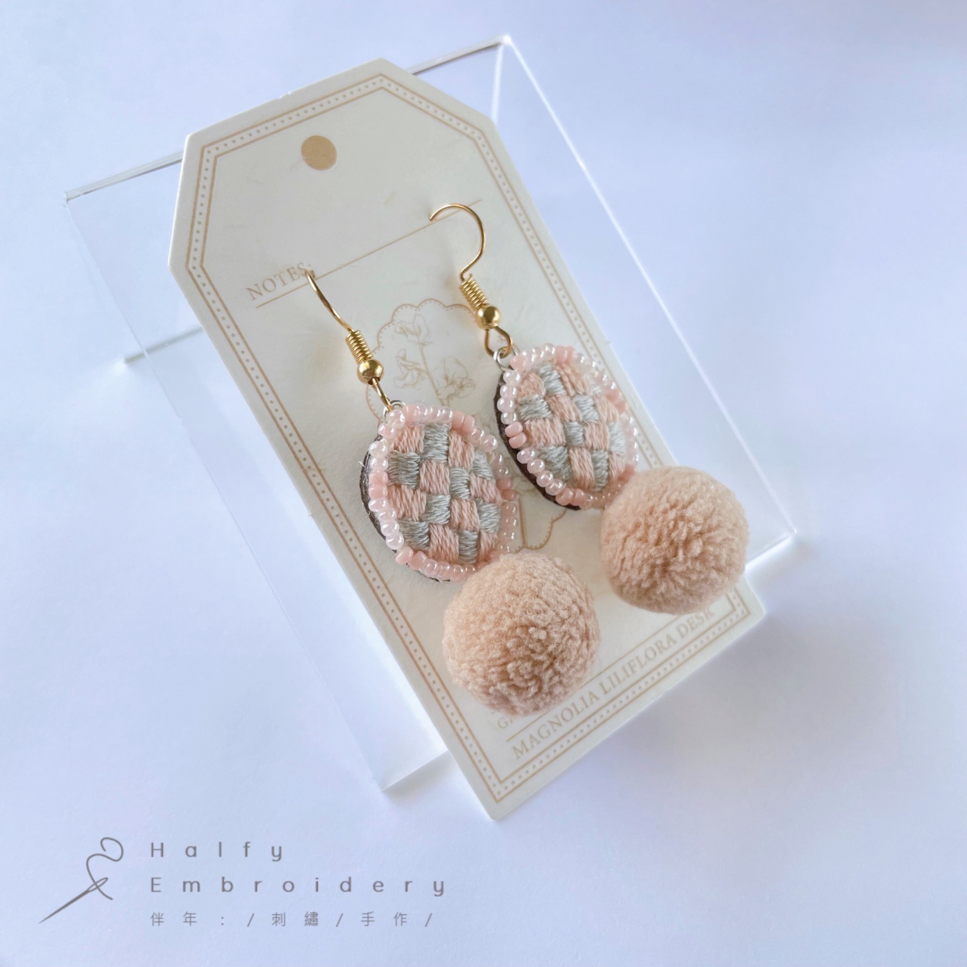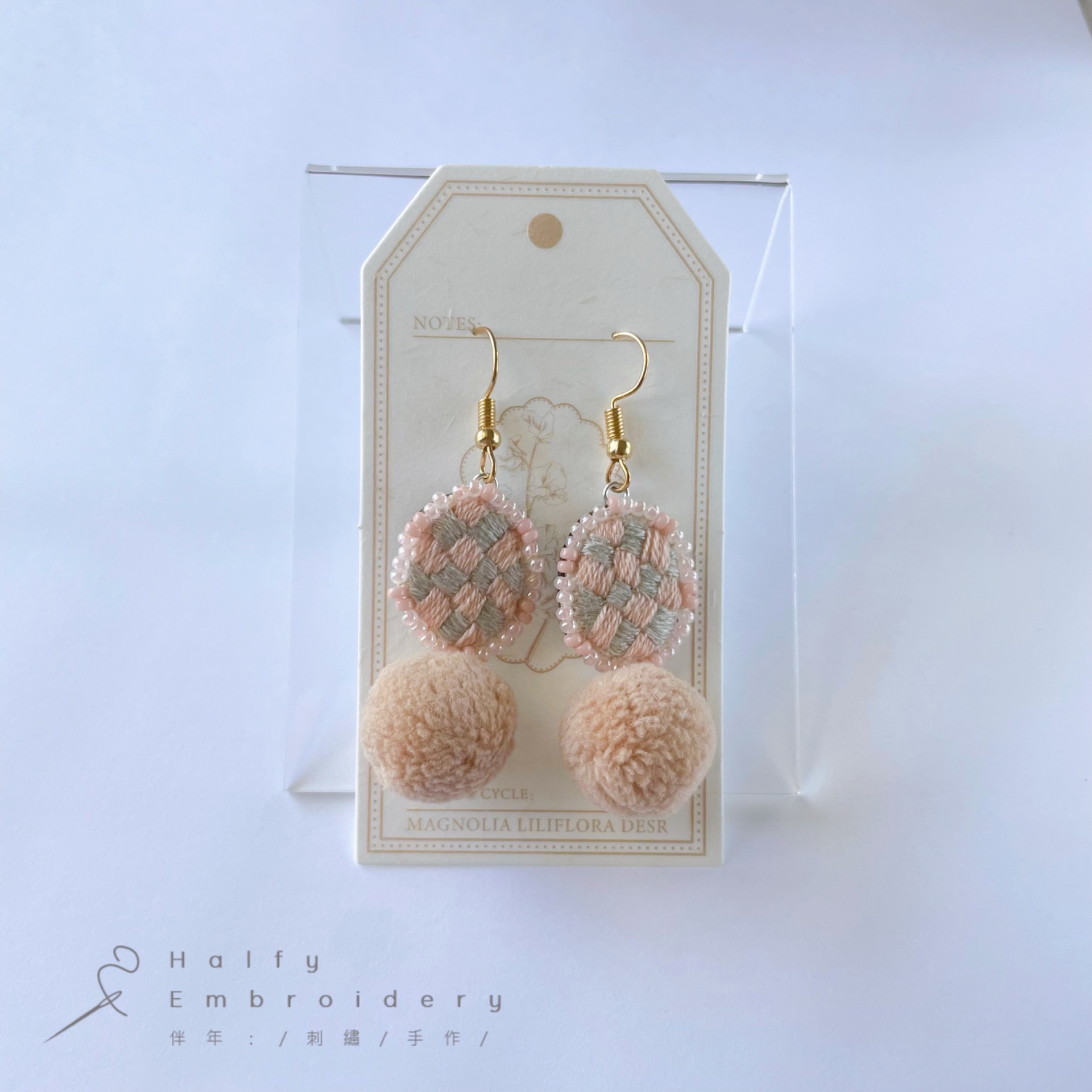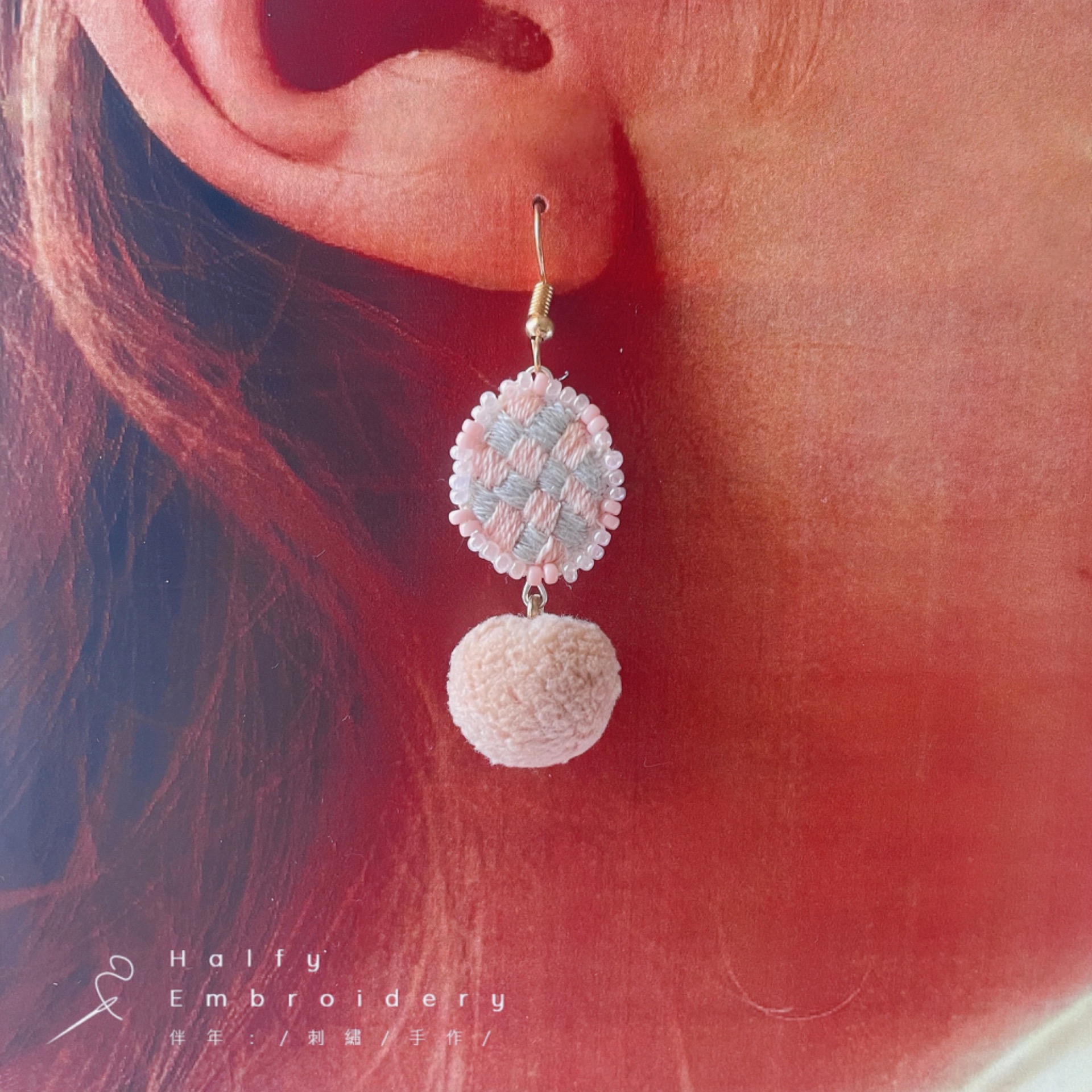 材質:電鍍K金耳勾、玻璃米珠、純棉繡線、奧粒絨球墜飾
