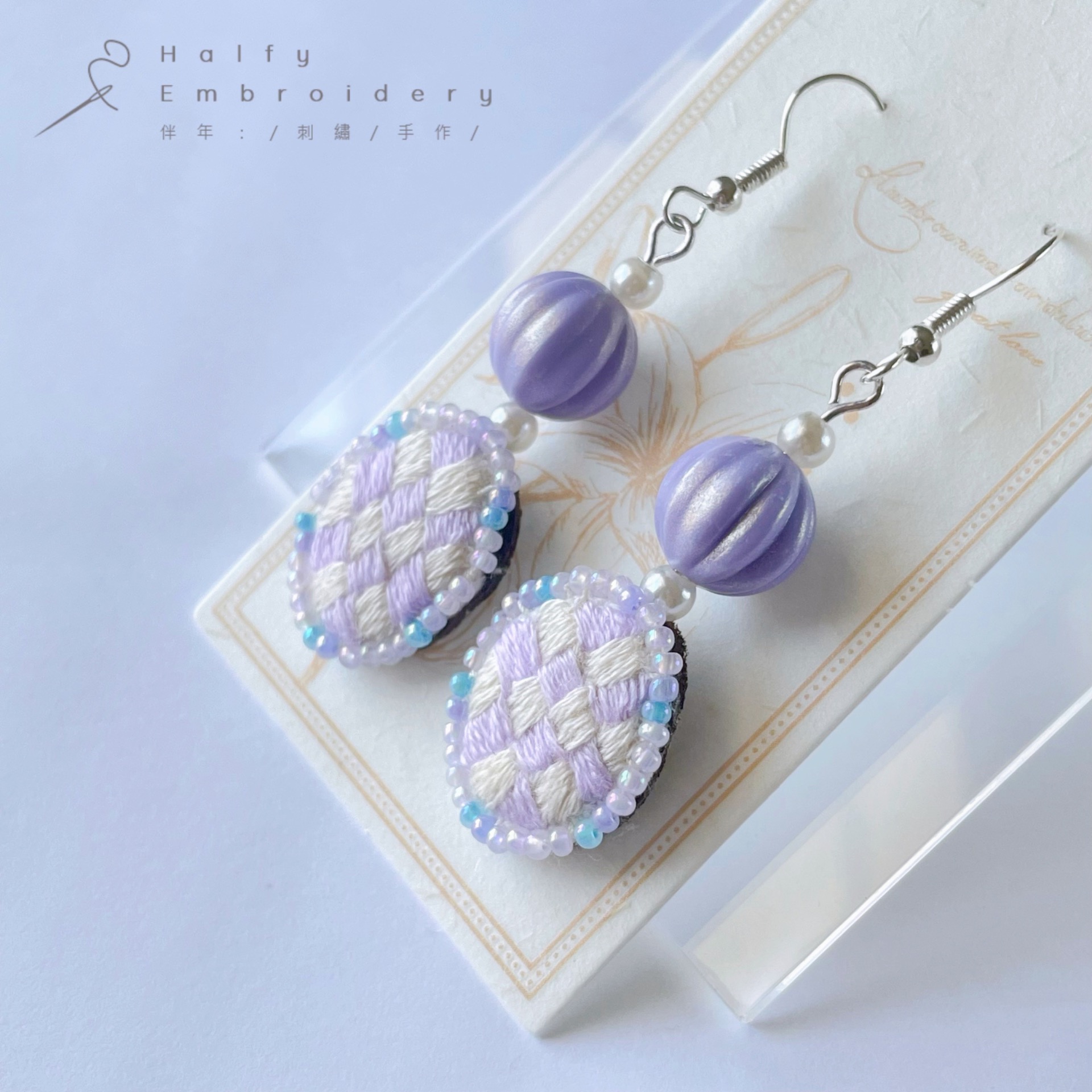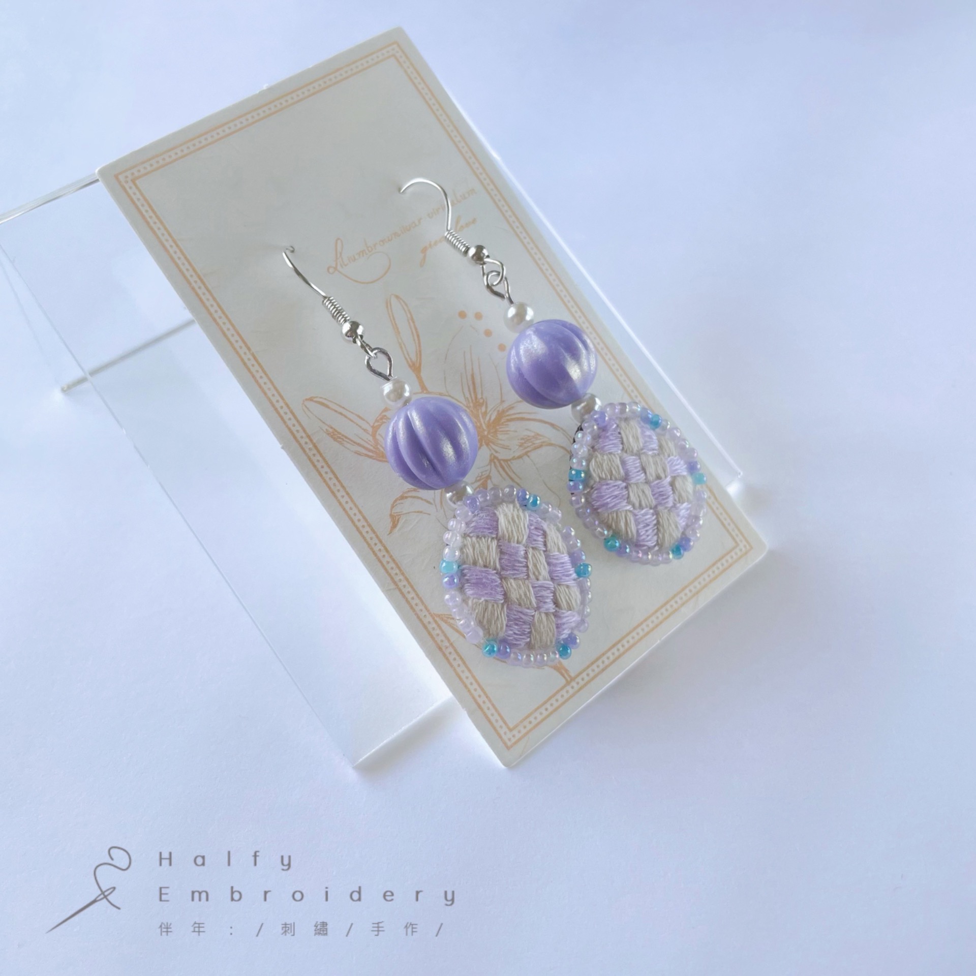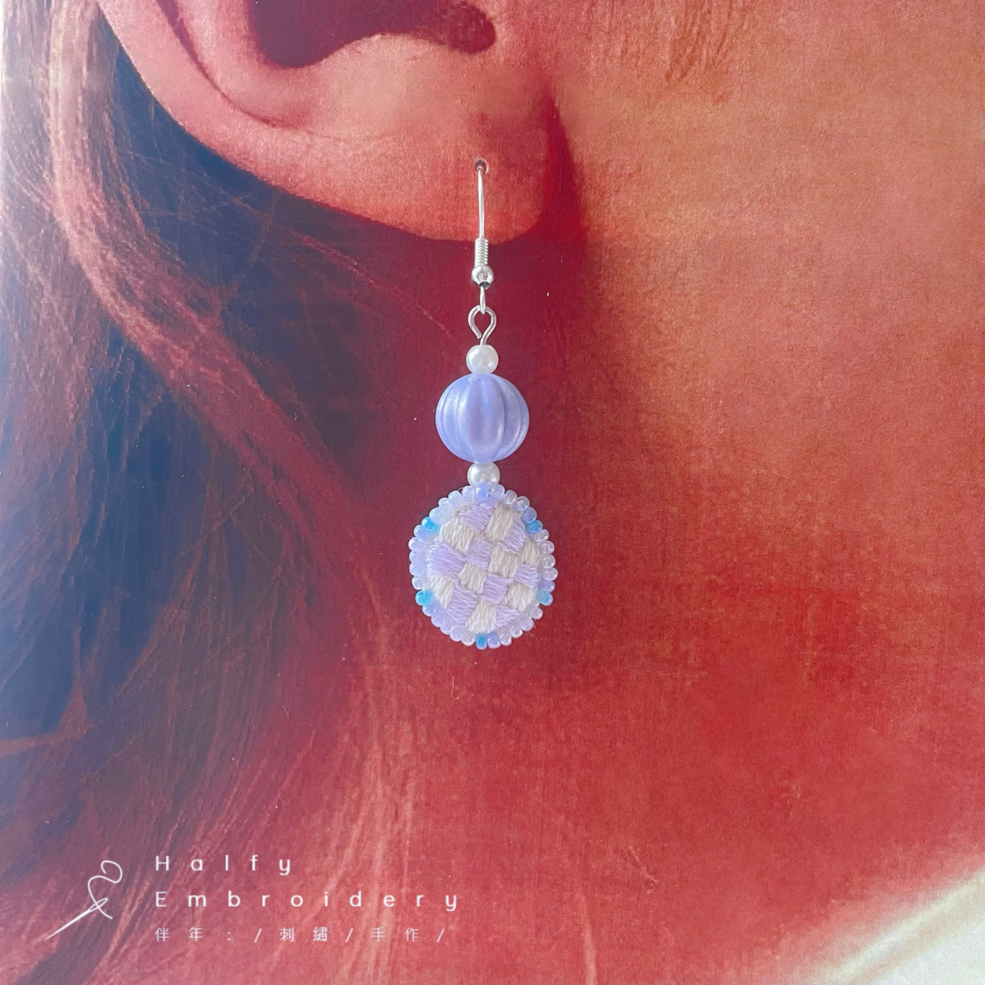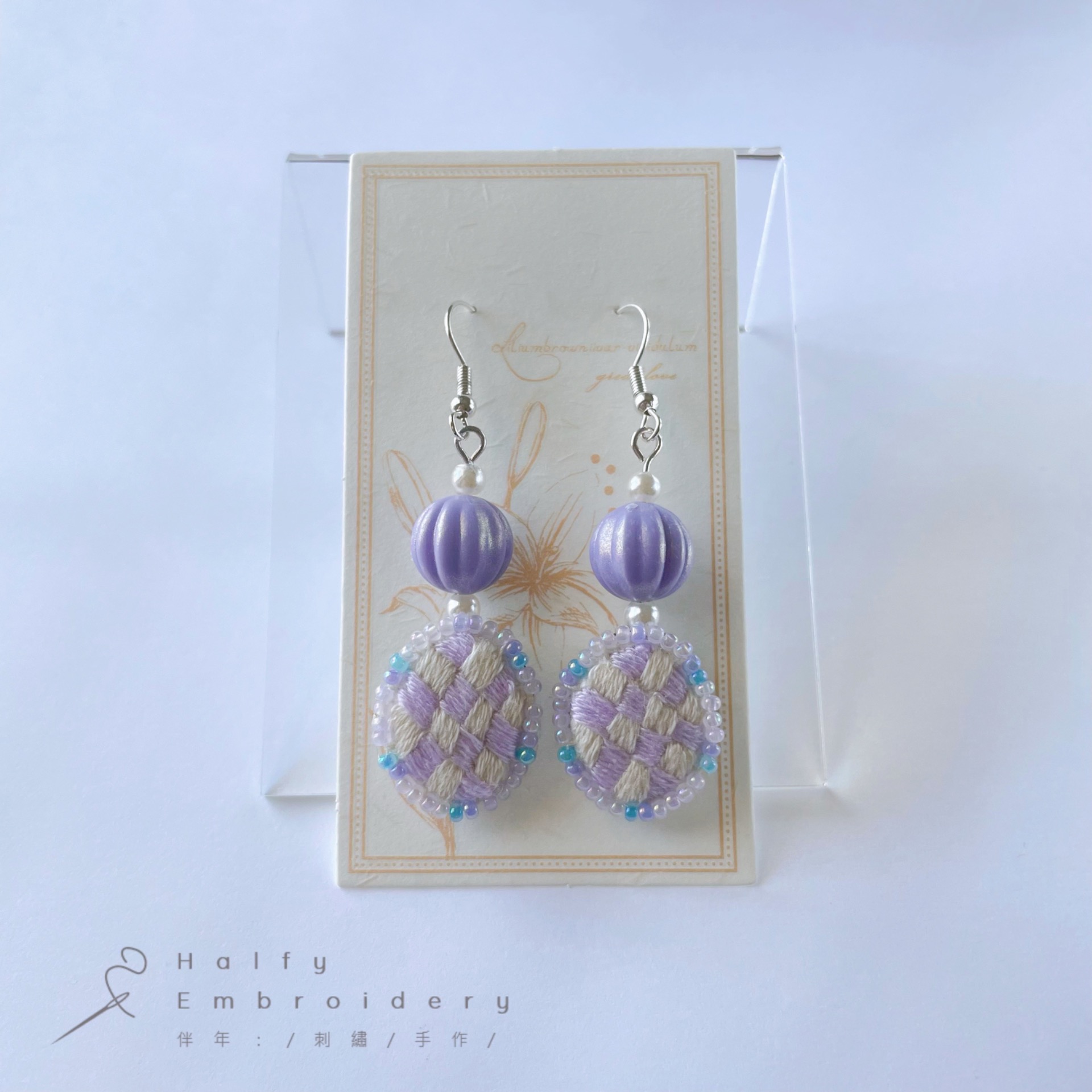 材質:鍍銀白金耳勾、珠光南瓜珠、玻璃米珠、純棉繡線