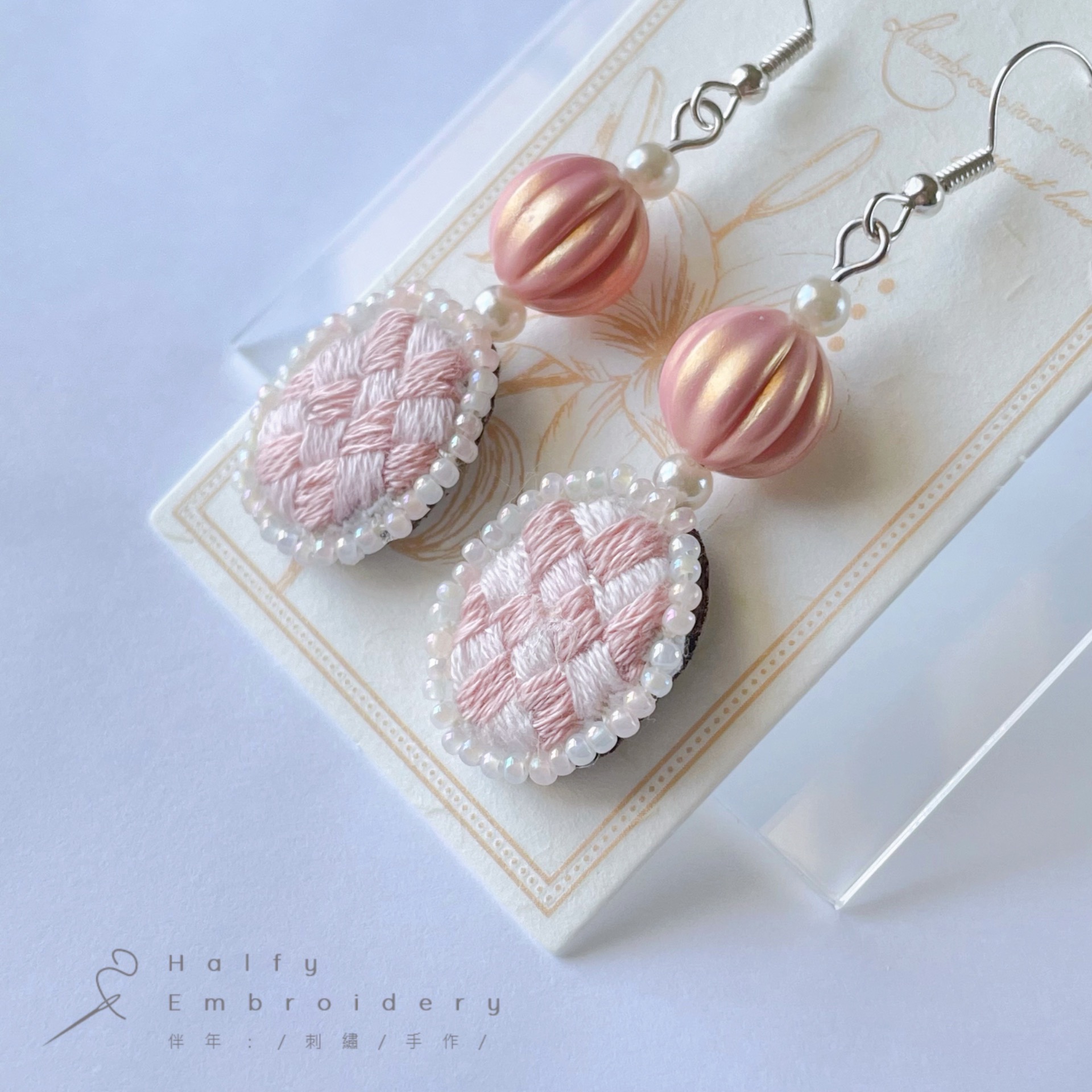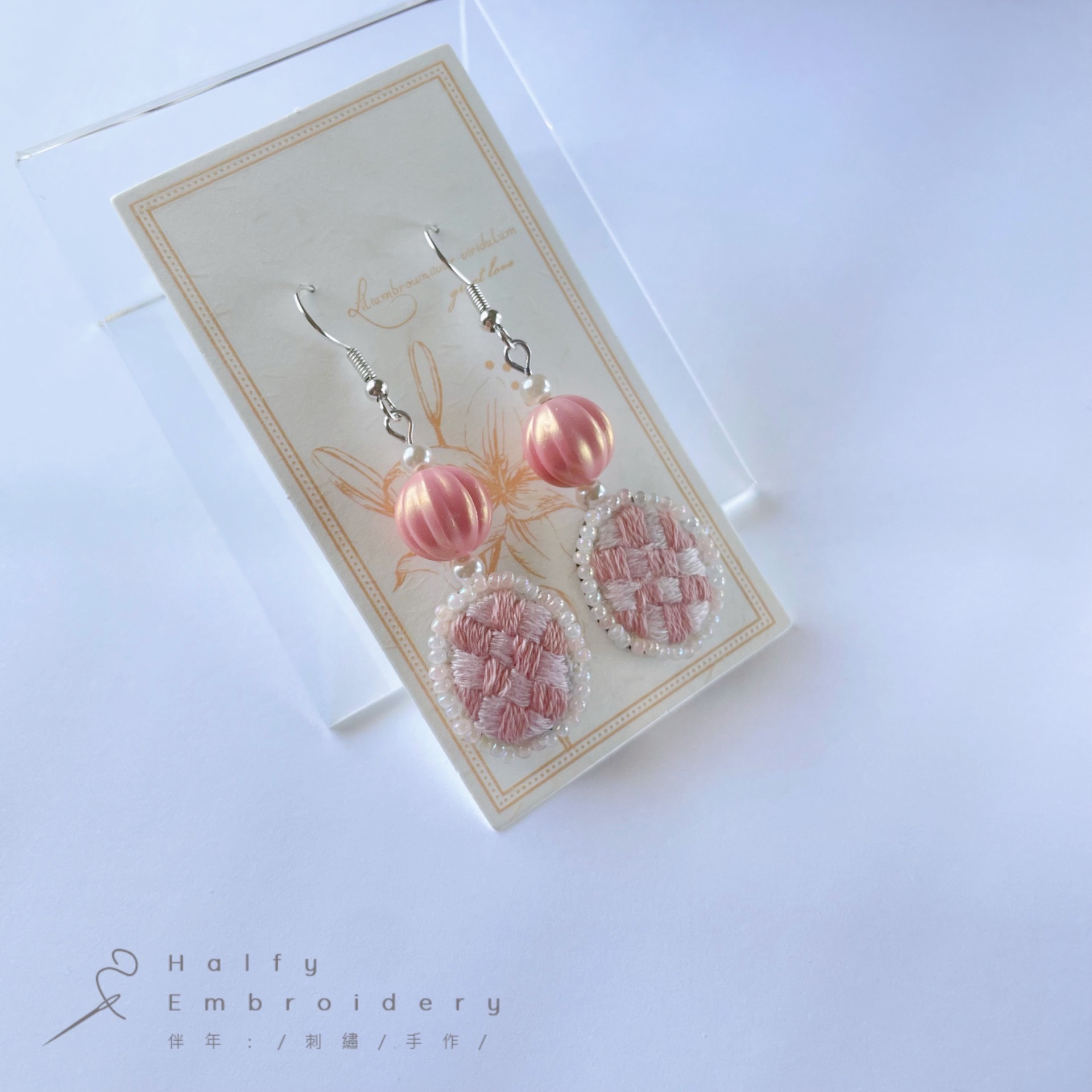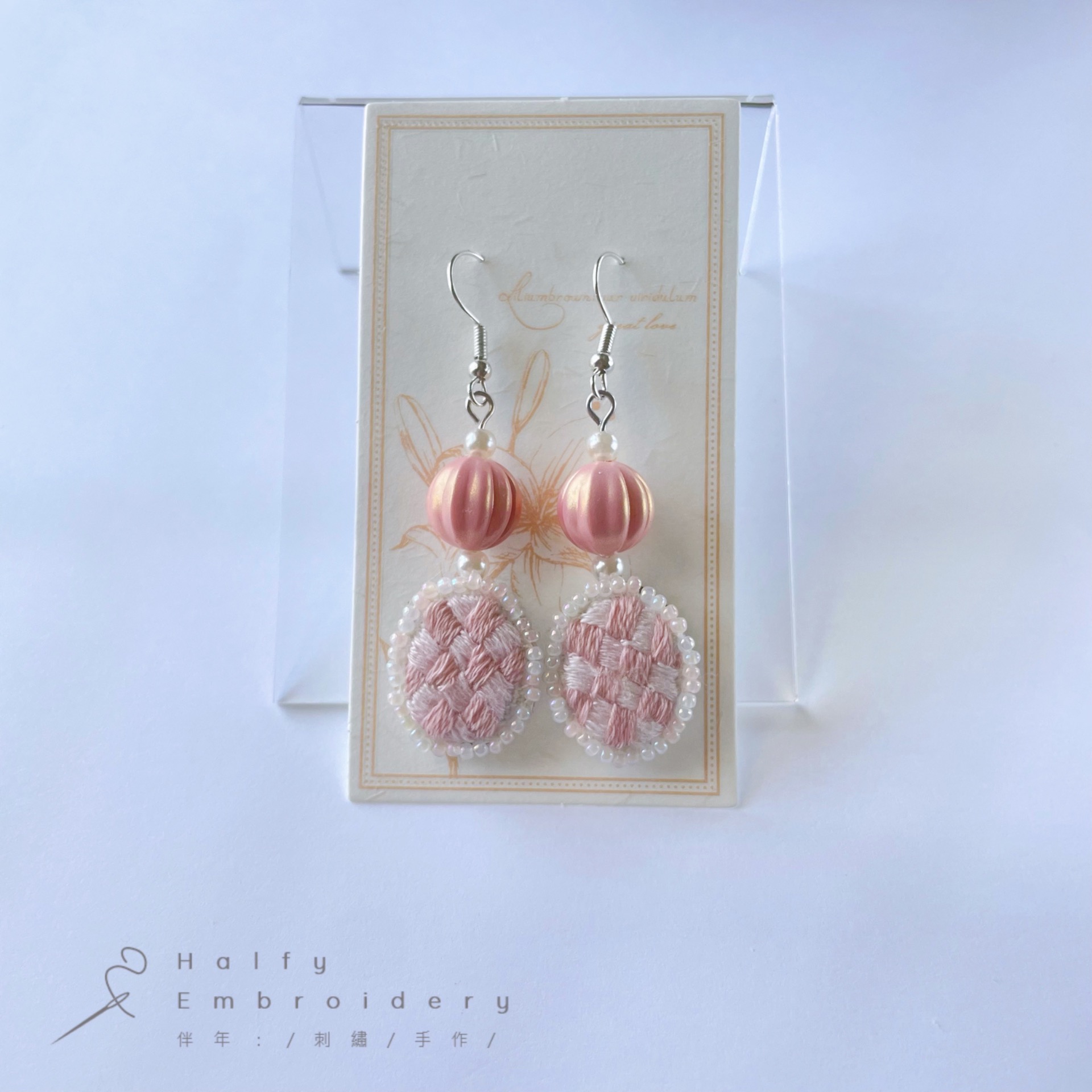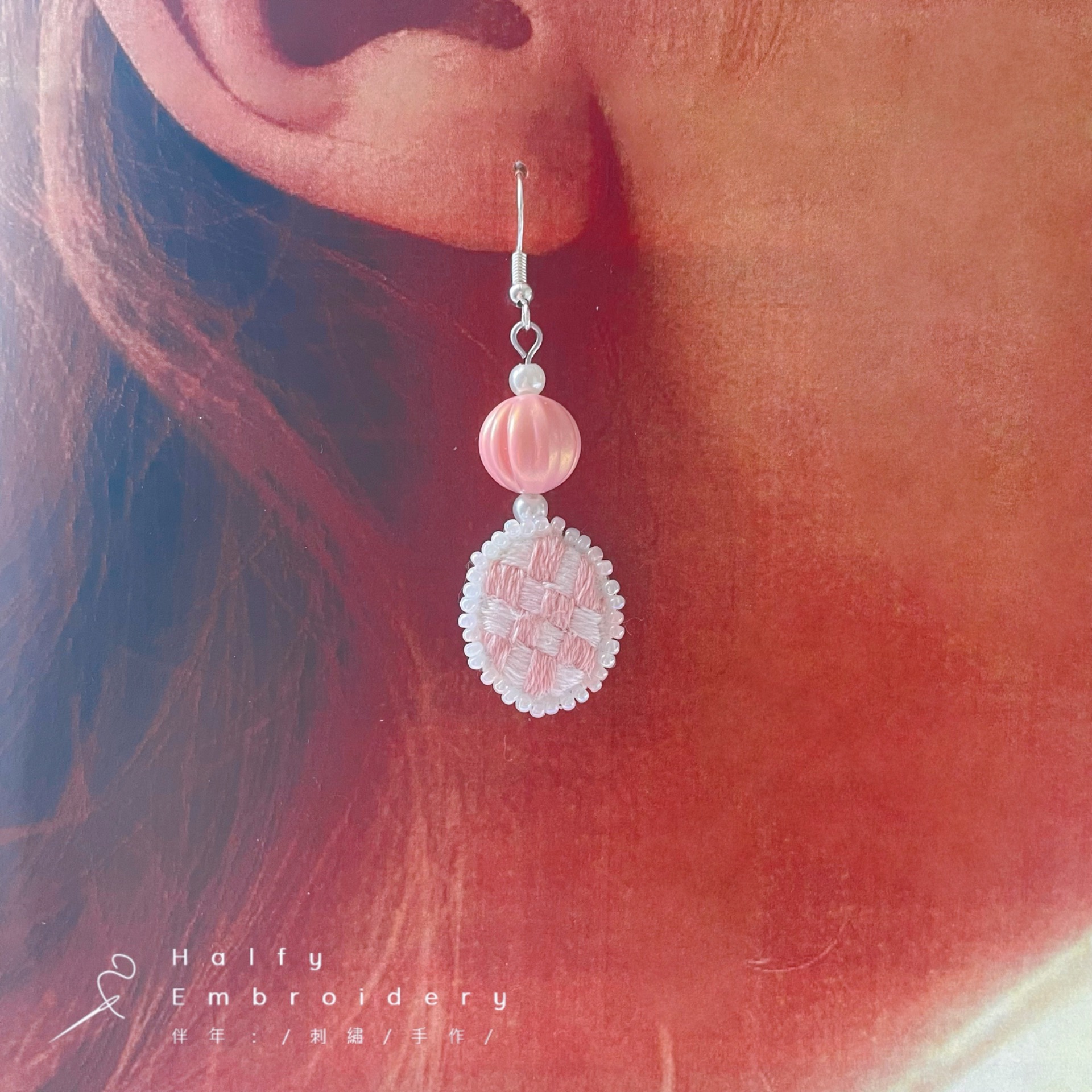 | 材質:鍍銀白金耳勾、珠光南瓜珠、玻璃米珠、純棉繡線