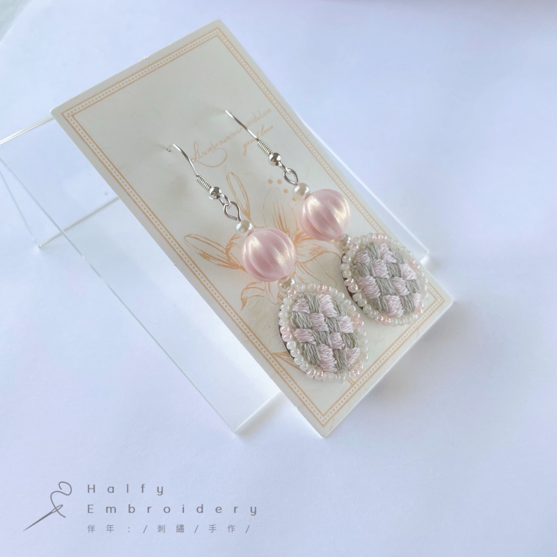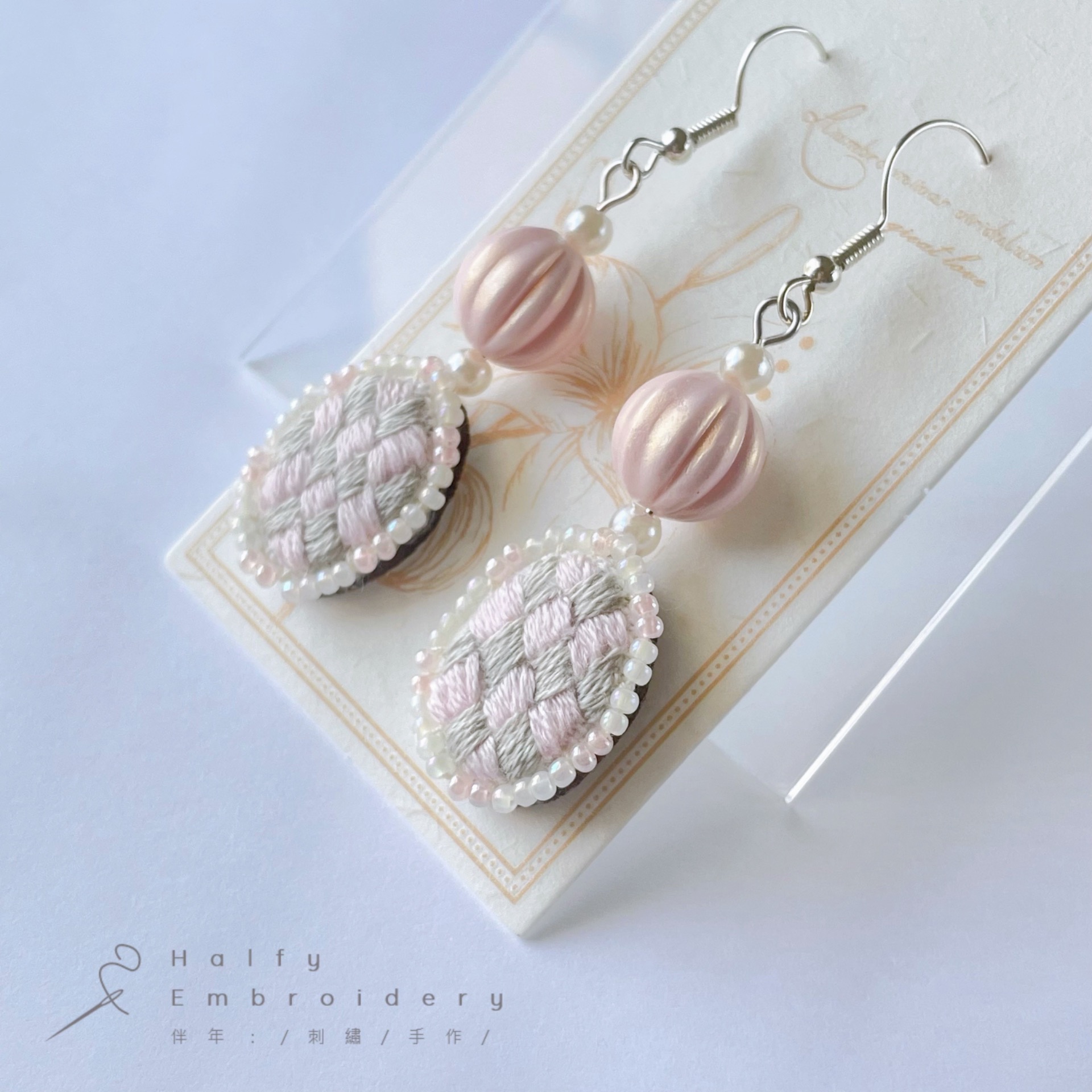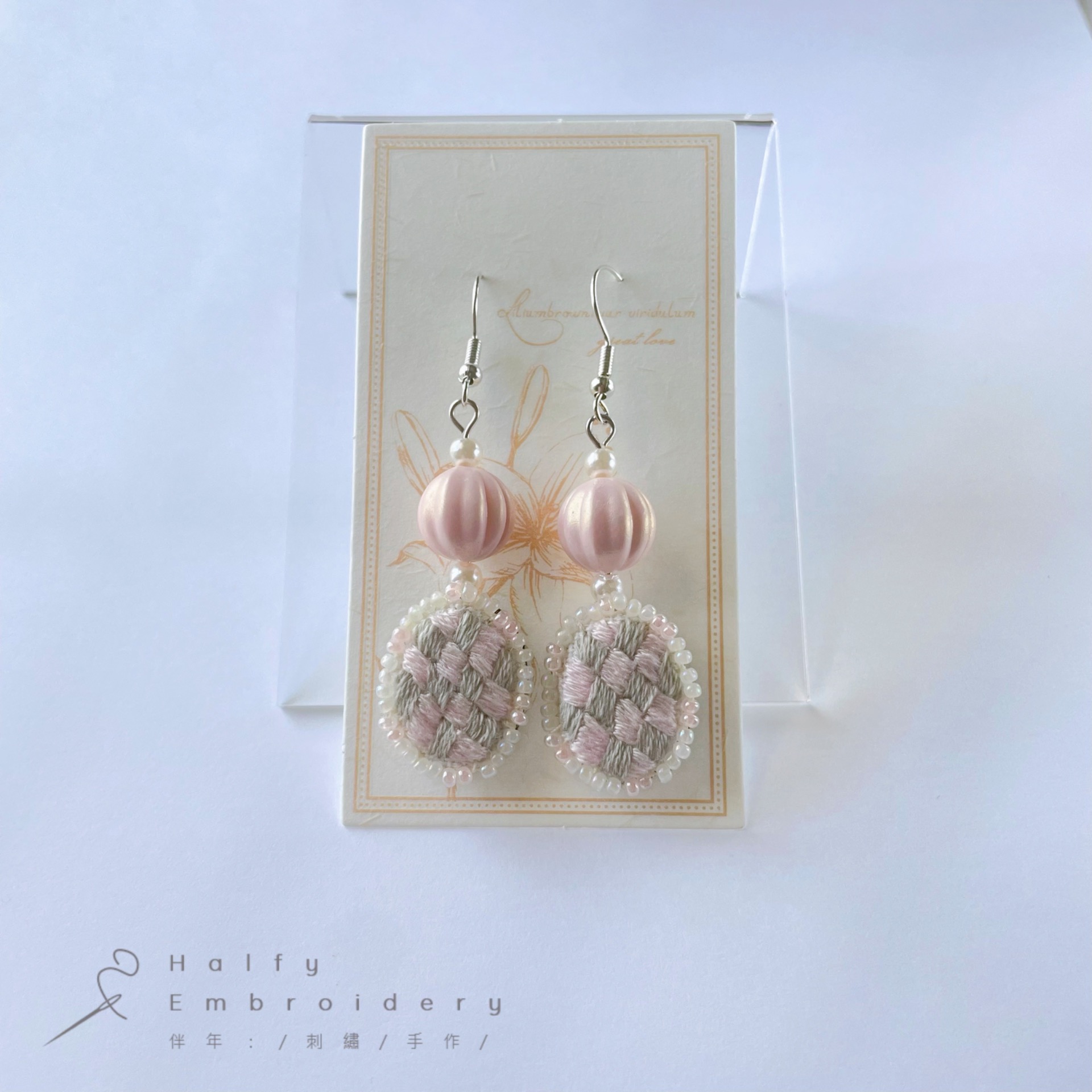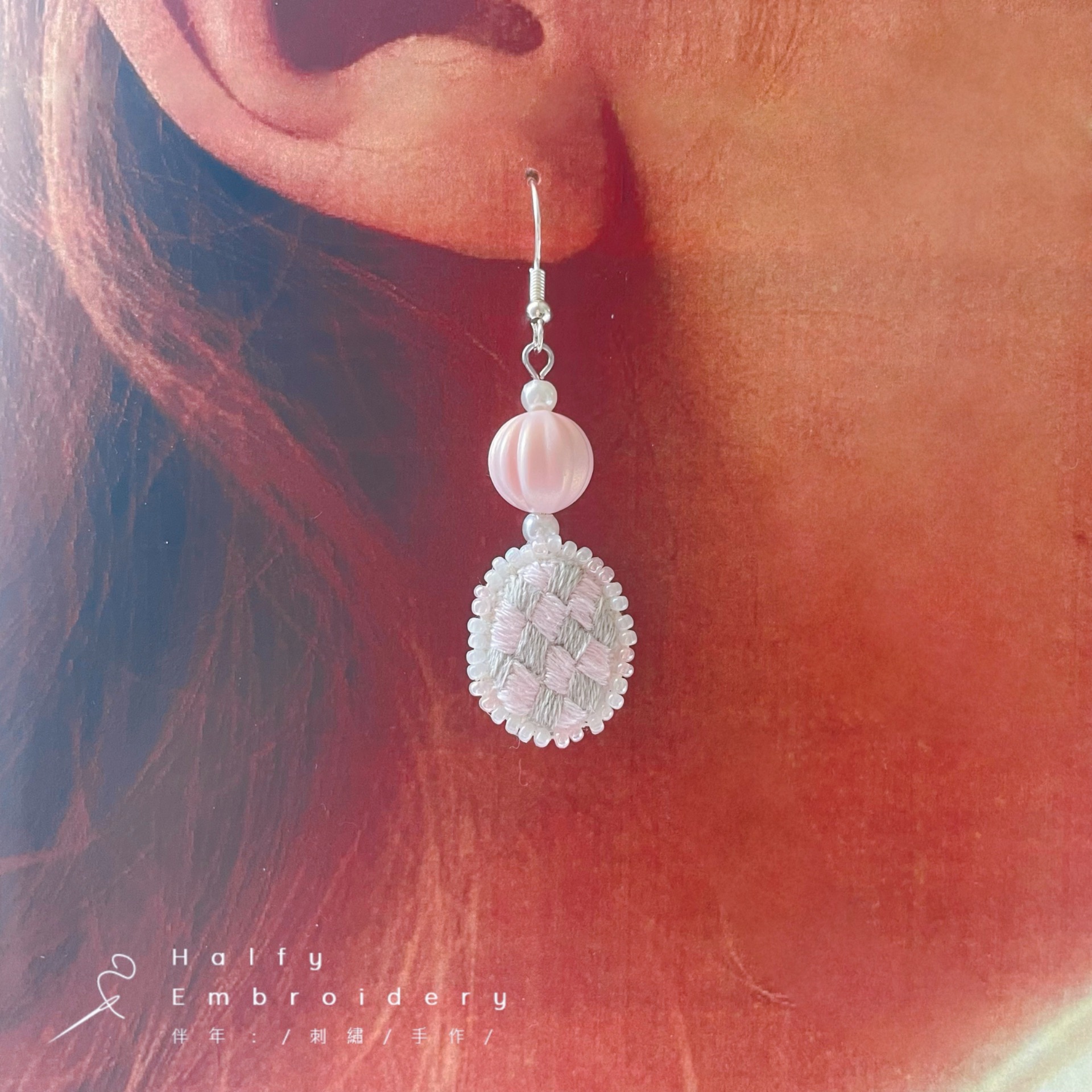材質:鍍銀白金耳勾、珠光南瓜珠、玻璃米珠、純棉繡線