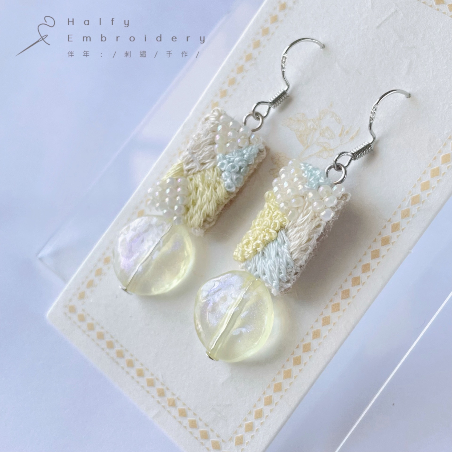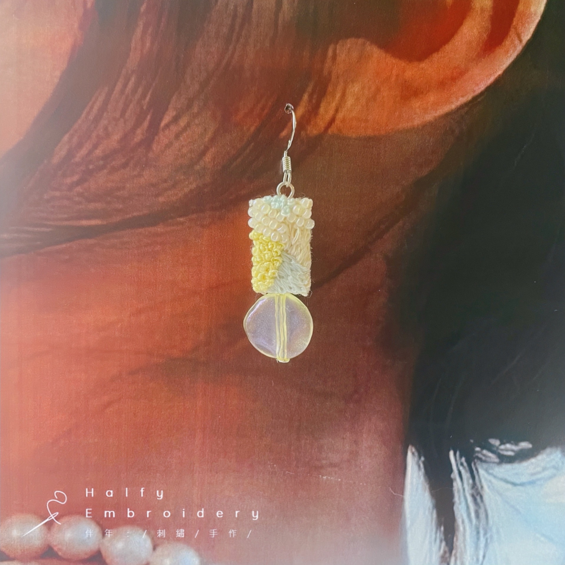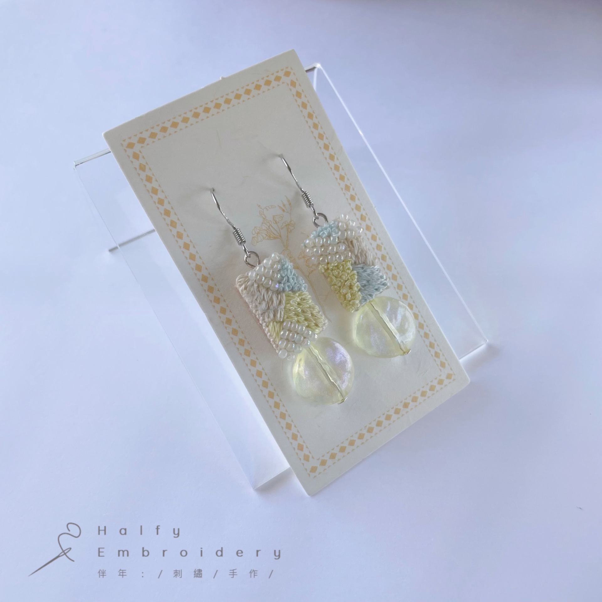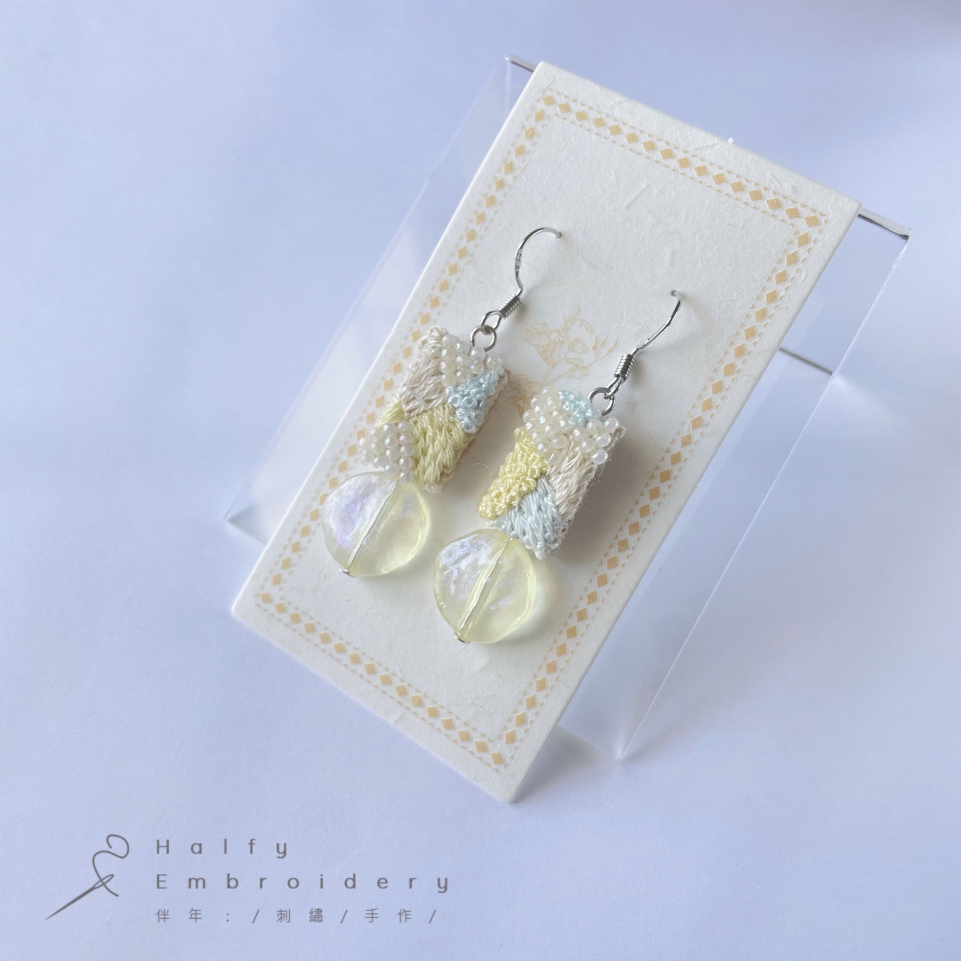 材質:鍍銀白金耳勾、透珠光玻璃扁珠、玻璃米珠、純棉繡線