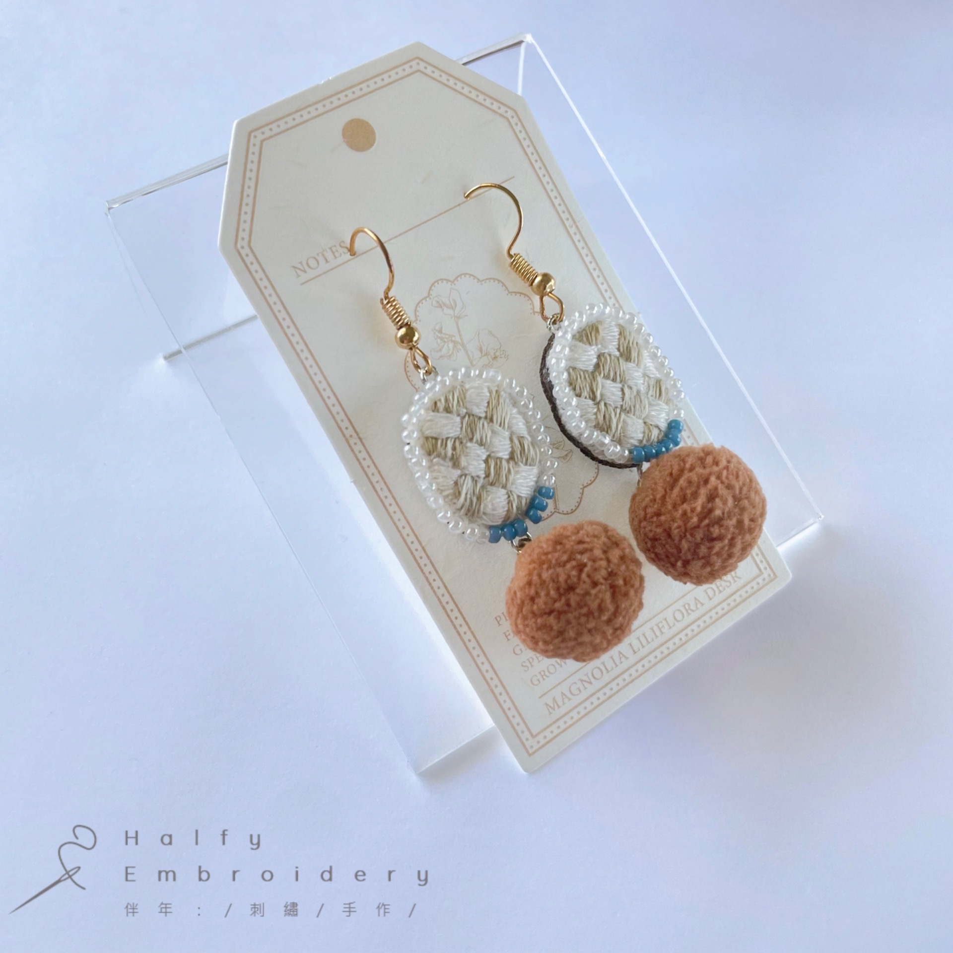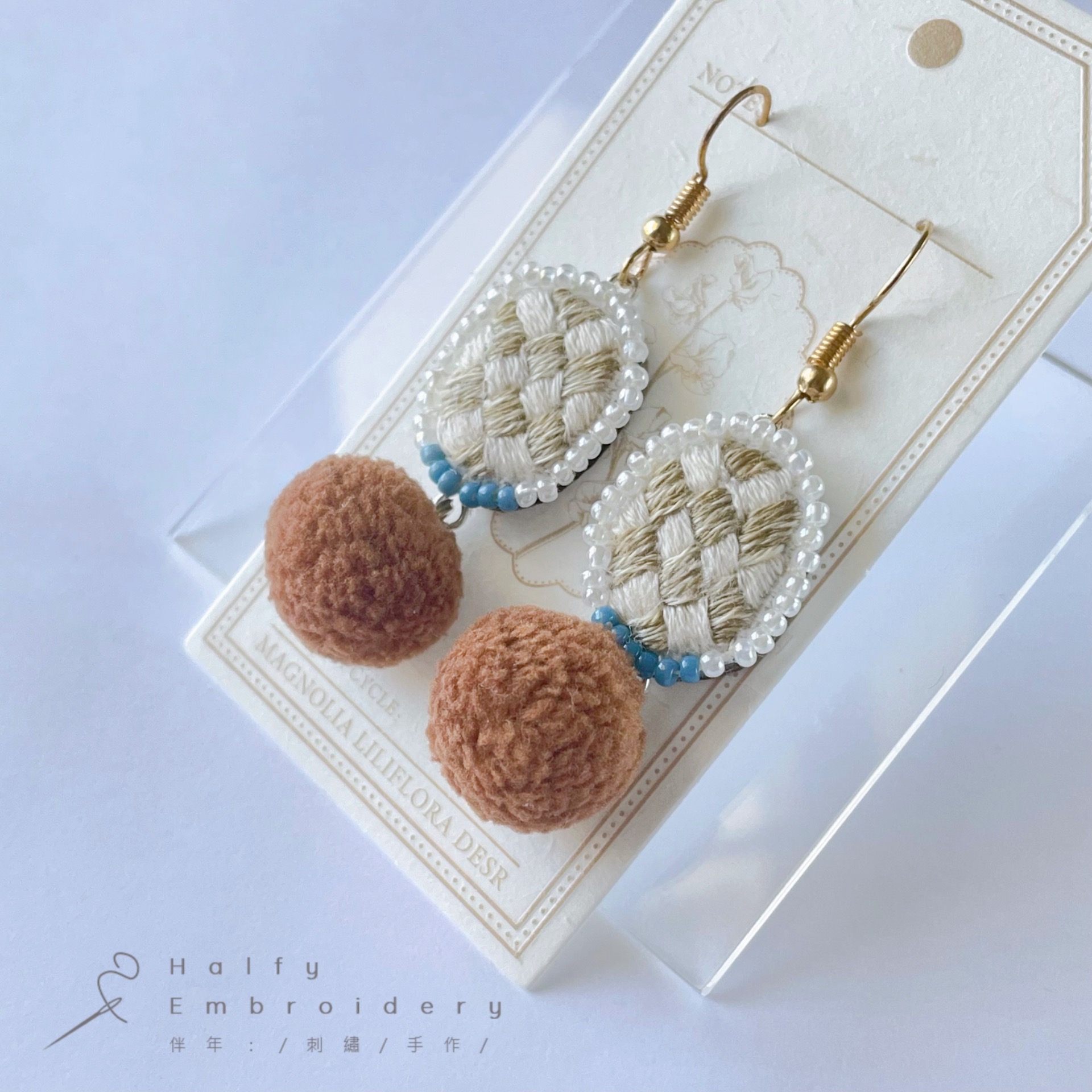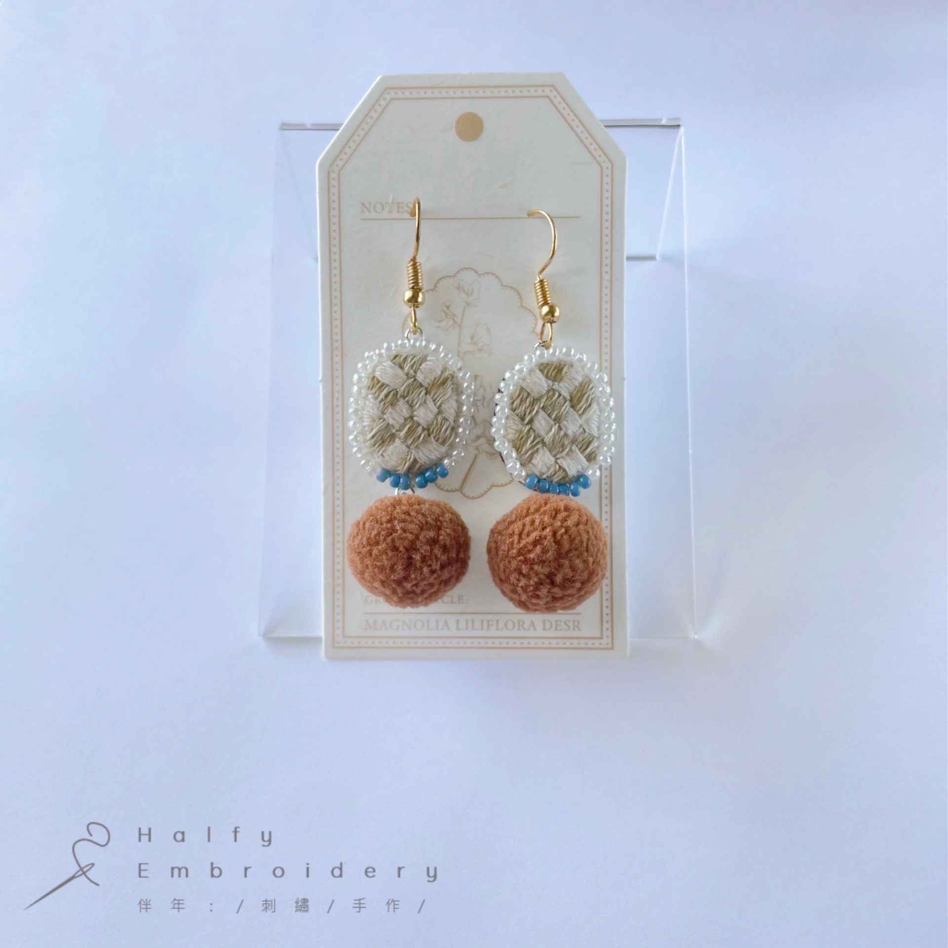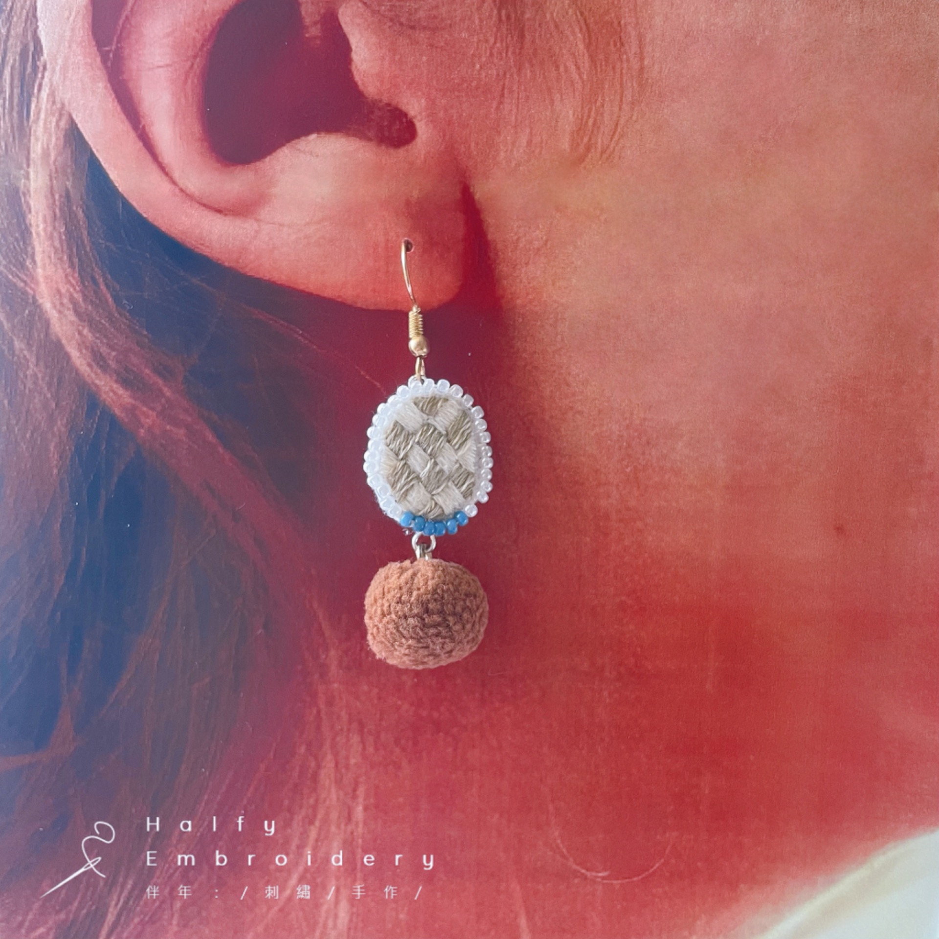 材質:電鍍K金耳勾、玻璃米珠、純棉繡線、奧粒絨球墜飾